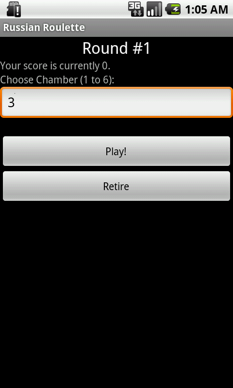A seriously simple game "simulating" Russian Roulette. Each round, pick a number between 1 and 6, and hope that it isn't the number of the chamber with the bullet, or it's game over.