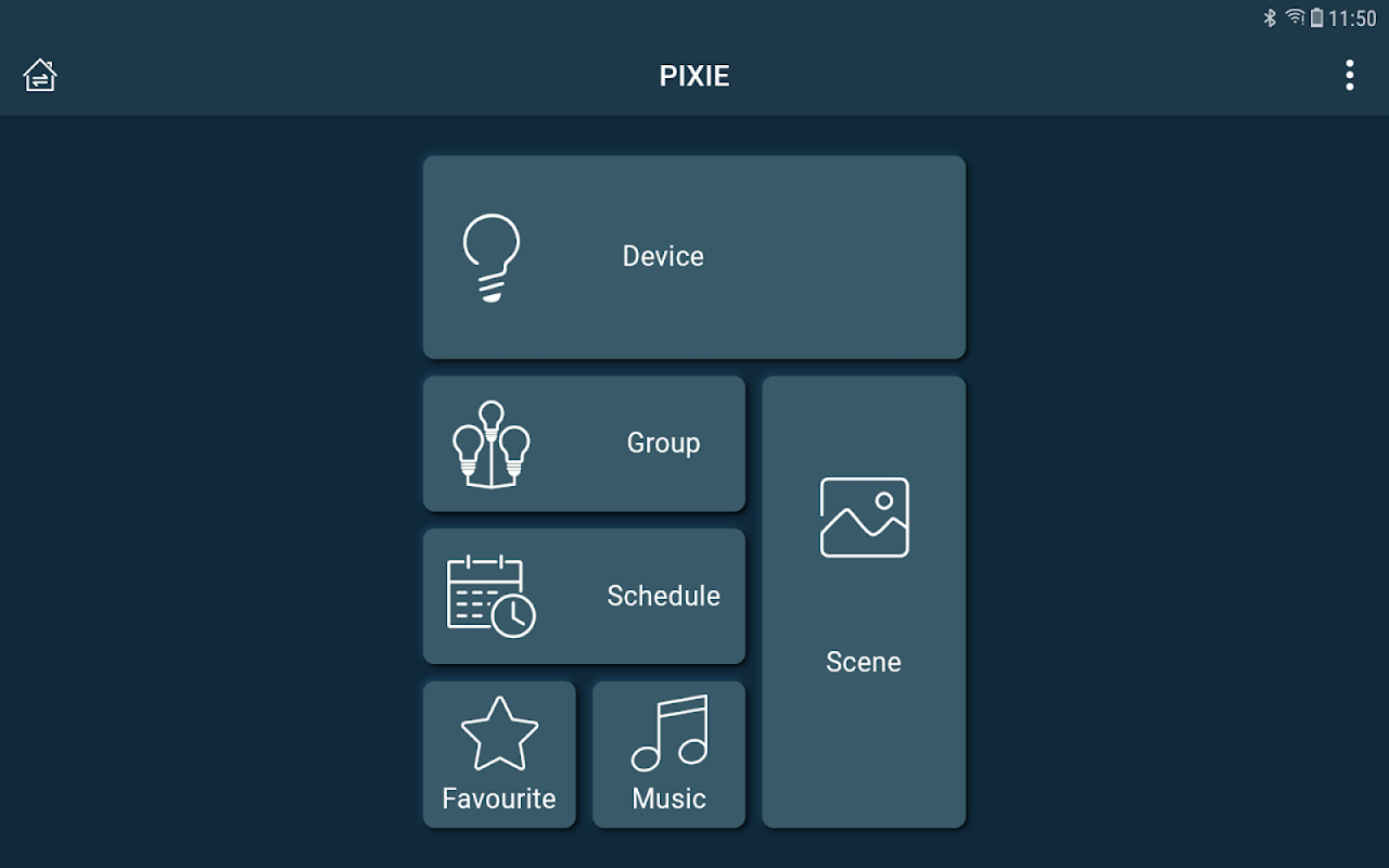 SAL PIXIE Uygulaması, bireysel PIXIE cihazlarının ve cihaz gruplarının kontrolünü sağlar, sahneler oluşturma ve geri çağırma ve kullanıcının ihtiyaçlarına göre günün veya gecenin herhangi bir saatinde programları çalıştırma yeteneği sağlar.