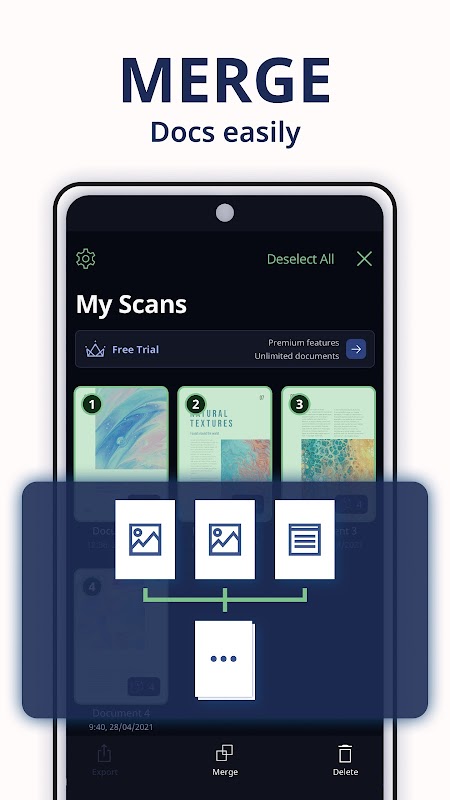 Merge different scans into only one document to manage your files more efficiently. Scan and merge files together, and add unlimited pages to previous documents.
