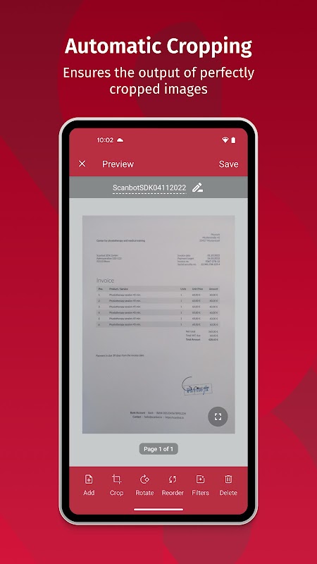 Otomatik yakalama ve kırpma işlevlerimizle, kullanıcılarınızın tek yapması gereken, arka ucunuz için mükemmel taramayı oluşturmak üzere cihazlarını bir belgenin üzerinde tutmaktır. Scanbot SDK gerisini halleder - rahatsız edici arka plana sahip bulanık ve kötü kırpılmış görüntüler geçmişte kaldı.