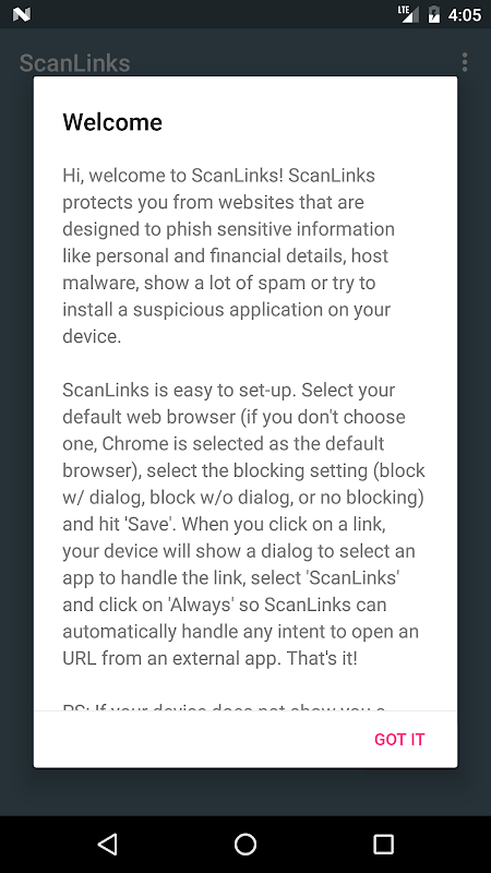 ScanLinks is easy to set-up. After installing the app, open the app & select the web browser you want to open websites in (if you don't choose one, Chrome is selected as the default browser to open websites in), select the blocking setting (block w/ dialog, block w/o dialog, or no blocking) and save the settings. When you click on a link, your device will show a dialog to select an app to handle the link, select 'ScanLinks' and click on 'Always' so ScanLinks can automatically handle any intent to open an URL from an external app. That's it!