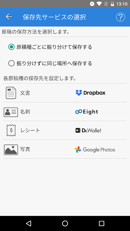 ● Taranan kağıdın türünü otomatik olarak tanımlar ve bunu dört türe ayırır: makbuz, kartvizit, fotoğraf ve belge. Daha sonra görüntü verileri, her sınıflandırma için kayıtlı bulut hizmetine otomatik olarak kaydedilir.