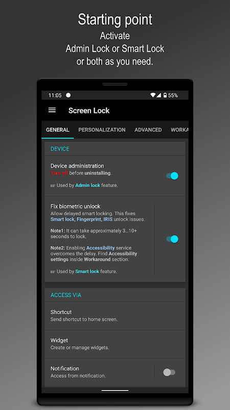 Ekran Kilidi, uygulama içindeki özelliği kullanarak donanım güç düğmesinin ömrünü uzatmak için oluşturulmuştur. Hem Yönetici kilidi hem de Akıllı kilit sistemi desteği. Seçtiğiniz tercihlere bağlı olarak cihazı Ekrandan Kapatmak ve kilitlemek kolaydır.