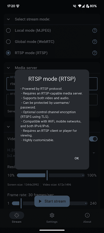 Tek dokunuşla ekranı ve ses paylaşımını WebRTC/MJPEG/RTSP aracılığıyla tarayıcılara/oynatıcılara güvenli hale getirin.