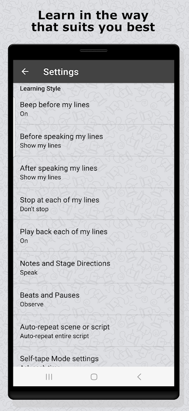 Script Rehearser, kişisel öğrenme stilinizi destekleyecek şekilde yapılandırılabilir. Örneğin: