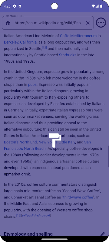 Bir web sayfasının tamamını tek bir kusursuz çekimde yakalamanıza olanak tanıyan yenilikçi bir uygulama olan 'Scroll Capture' ile tüm web içeriğinizi tek bir görüntüde karşılayın. Uygulamanın yerleşik web görünümünde herhangi bir karmaşık prosedür olmadan herhangi bir web sayfasına gidin. 'Scroll Capture' gerisini halleder ve bir web sayfasının kayan içeriğini sorunsuz bir şekilde tek bir görüntü dosyasına dönüştürerek tek bir ayrıntının kaçırılmamasını sağlar.