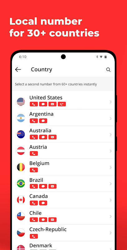 ÇEŞİTLİ NUMARALAR: Uygulama, 30 ülkenin numaralarının bir listesini görüntüler. İşte en popüler ülkelerden bazıları: ABD, İngiltere, Kanada, Almanya, Fransa, Japonya, vb. Sanal numaralar gerçek numaralar gibi kullanılır, ikinci SIM'e gerek yoktur!