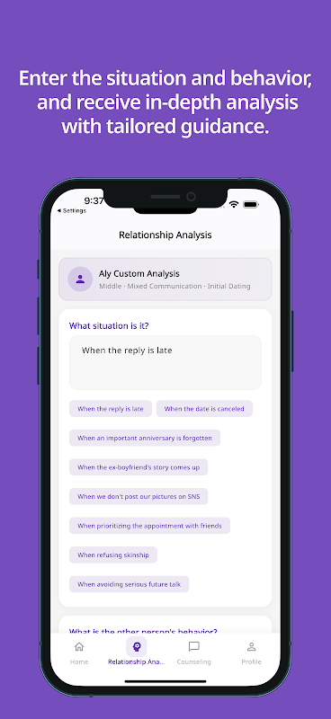 Durumlara ve davranışlara girerek, her ilişkiye özel ayrıntılı içgörüler, duygusal yorumlar ve kişiye özel tavsiyeler alabilirsiniz.
