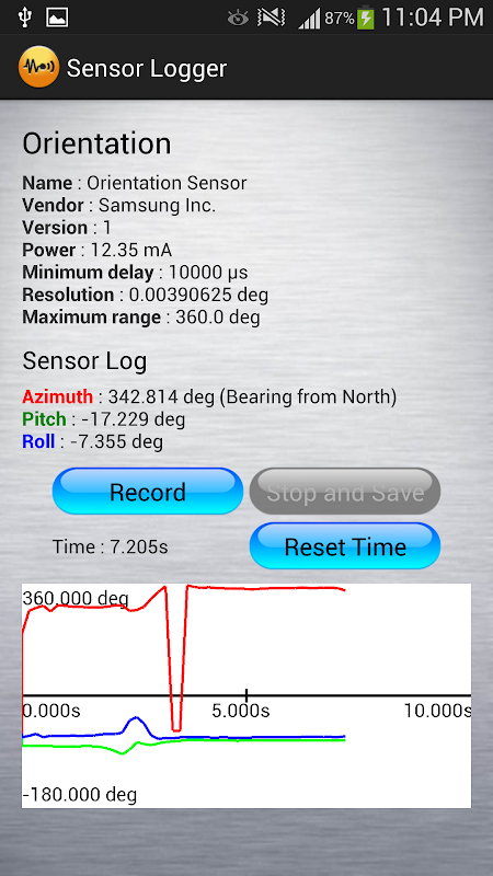 Sensor Logger also has real-time colour graphs which display the time history of the measurements