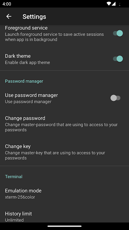 &Boğa; Yerleşik şifre yöneticisi sayesinde her sunucu ve anahtar için şifreleri aklınızda tutmanıza gerek kalmaz. Şifre veritabanı cihazda saklanır ve ana anahtar kullanılarak AES256-CBC ile şifrelenir. Ayarlardan şifre yöneticisini yönetebilir veya tamamen devre dışı bırakabilirsiniz.