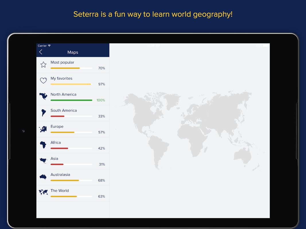 Seterra, 300'den fazla farklı alıştırma içeren, kullanımı kolay bir harita bilgi yarışması oyunudur.