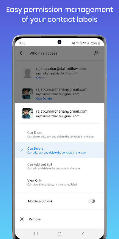 Ayrıca Google Kişilerinizi uygulamamızla yedekleyebilirsiniz. Ayrıca, sezgisel arayüzümüz ve güçlü entegrasyonumuz, uygulama kontrol panelinize giriş yapmak zorunda kalmadan kişileri doğrudan Gmail™ ve Google Kişiler'den düzenlemenize ve paylaşmanıza yardımcı olur.