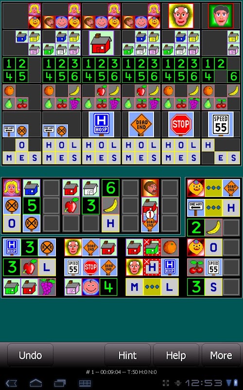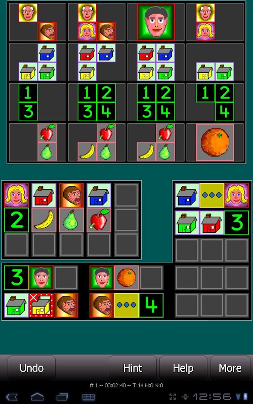 Sherlock is a computerized version of logic puzzles, where you're presented with a series of clues that help you to determine the exact locations of all of the images on the playing board. The puzzles are all 4x4, 5x5 or 6x6. Each row of the playing board contains images of the same type (faces, houses, numbers, fruit, street signs, letters, etc). The game scrambles the locations of the items in each row (without showing you their locations) and then presents to you a set of graphical clues that describe the positional relationships of different images. You use the clues to deduce where things can't be (and where they HAVE to be) until you know where all of the images are located.