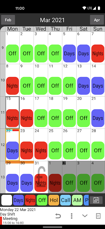 Vardiyalı Çalışma Takvimi, takvime hızlı bir şekilde eklenebilen ve hızlı bir bakışta görülebilen kendi renklerinizi ve adlarınızı seçerek kolayca farklı kaydırma desenleri oluşturmanıza olanak tanır.