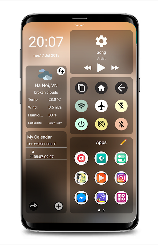 2. Click on floating button -> Open window with all you need -> time, event, weather, music, tools, favorite app, recent app...