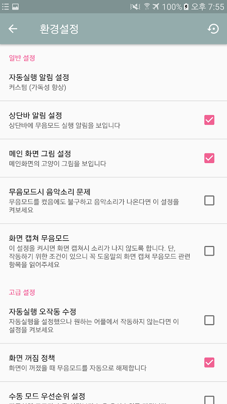 ■ 중요 고지사항 : 무음모드를 수동으로 설정하신 후 해제하지 않고 어플을 삭제하시면 무음모드가 설정된 채로 유지됩니다.