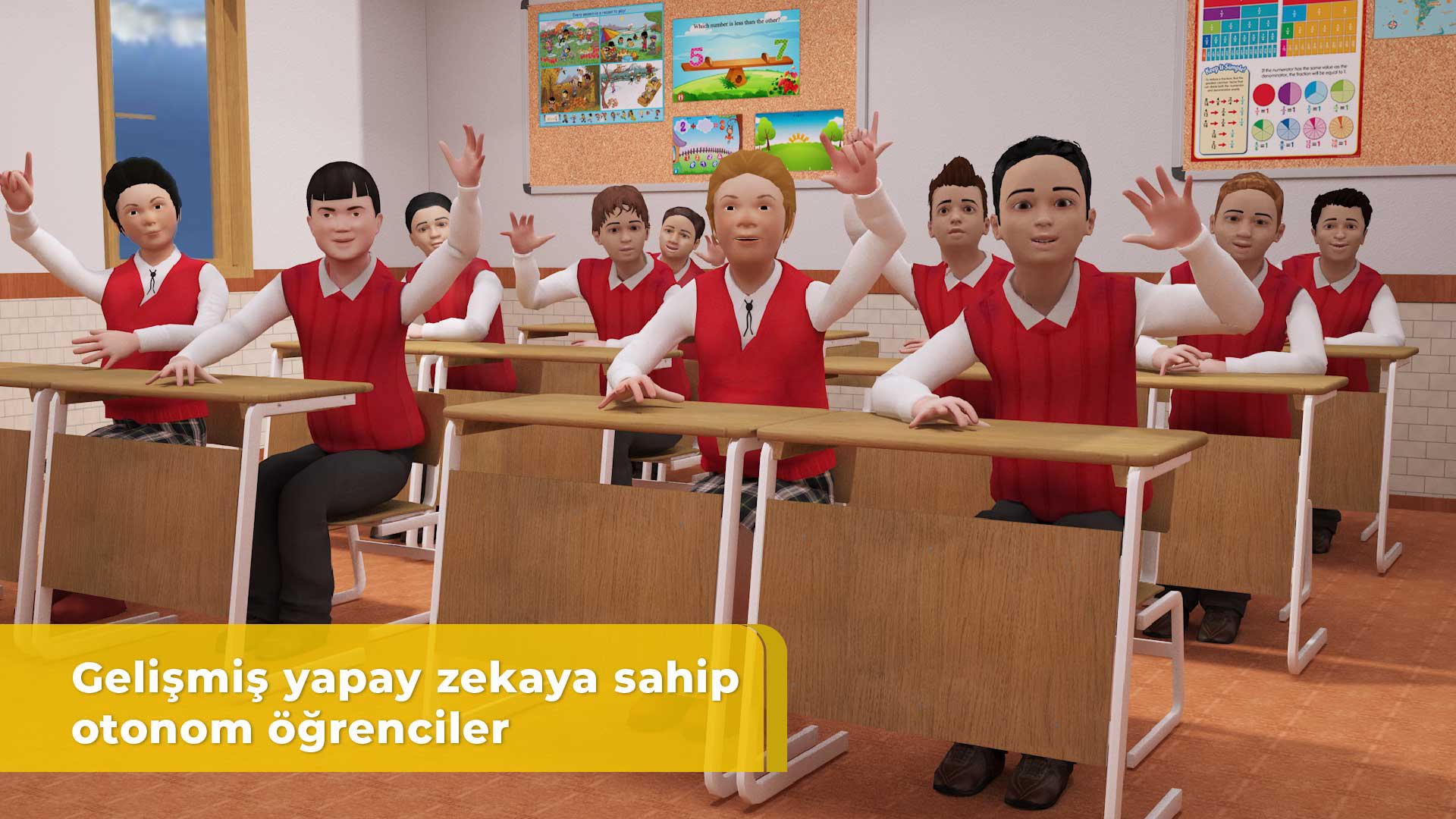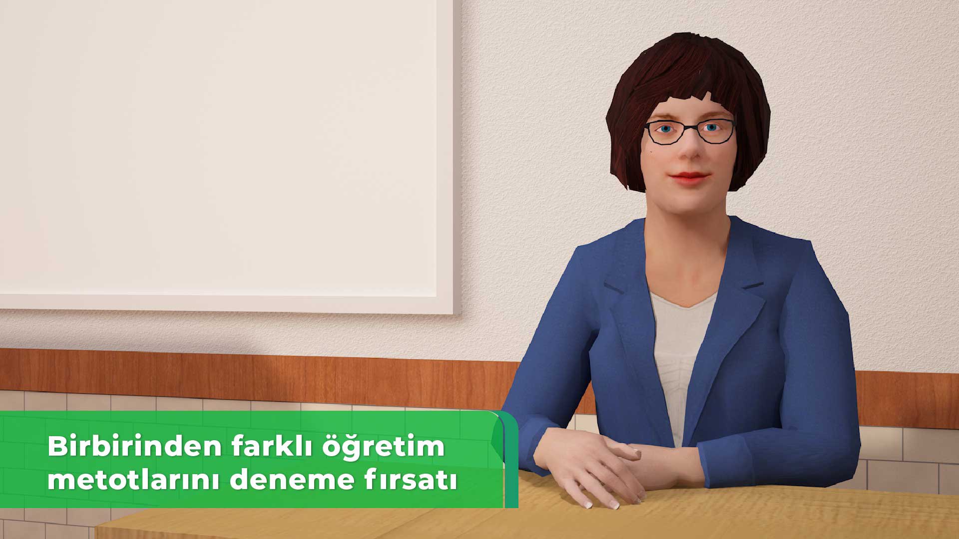 3D (Üç boyutlu) sanal sınıfta yapay zekalı öğrencilerle değişik seviyelerde, senaryolarla uygulama olanağı sunmaktadır.