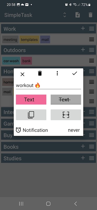 Yapılacaklar listelerini, notları, alışveriş listelerini, istek listelerini vb. yönetmek için basit ve pratik bir uygulama. Yeni bir görev (not) eklemek, rengini ve muhtemelen diğer özelliklerini ayarlamak ve onu uygun yere yerleştirmek çok hızlı ve kolaydır. liste (sayfa). Basit bir kaydırma hareketi ile bir görevi kolayca silin veya listedeki başka bir yere veya başka bir sayfaya taşıyın. Tüm görev listeleri isteğe bağlı olarak genişletilerek tek bir ekranda net bir şekilde görüntülenir. Görevlerinizin önizlemesini ana ekranınızda bir widget biçiminde görebilirsiniz.
