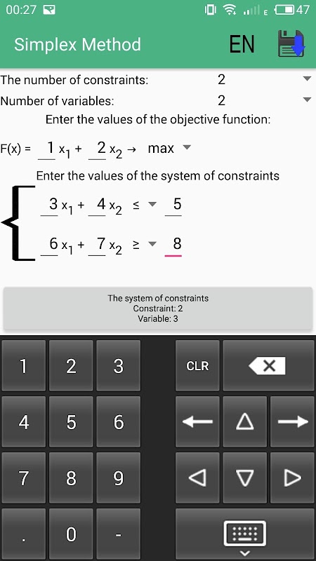 Bu uygulamada, bu çok hızlı mümkündür Internet erişimi olmayan yöntemle doğrusal programlama problemlerini Simpleks çözmek için. Ayrıca programa çok uygun, anlaşılır arayüzü ve çözelti adım ayrıntılı aşamasında anlatılan