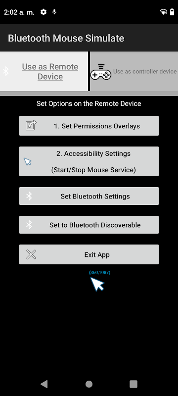 Kullanıcı bu özelliği AccessibilityService kullanmayı kabul ederse, uygulama fare işaretçisini ekran üzerinde simüle etme ve Bluetooth komutlarının imleci hareket ettirmesini bekleme yeteneğine sahip olacaktır. Aksi takdirde, kullanıcı bu fonksiyonun kullanımını reddederse, alıcı cihaz olarak kullanılamaz ancak kontrol cihazı olarak kullanılabilir.