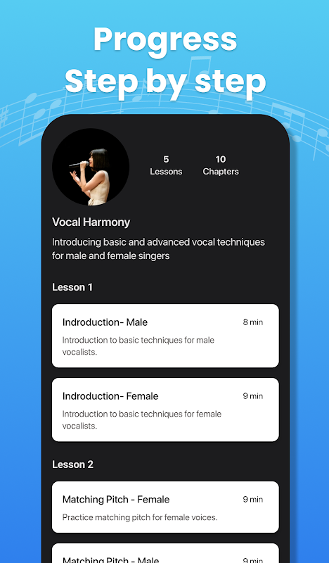 Şarkı söyleme dersleri uygulamamızla sesinizi bir üst seviyeye taşıyın! "Şarkı söylemeyi öğrenme" uygulamasını hemen indirin ve daha iyi bir şarkıcı olma yolculuğunuza başlayın!