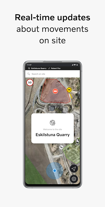 Hız sınırlarını, kısıtlı alanları ve bulunduğunuz yere yakın makinelerin ve kullanıcıların gerçek zamanlı konumlarını göstererek farkındalığı artırın. Bölgelere ve ilgi çekici noktalara giden yolu bulmak veya makinelerin veya kullanıcıların şu anda nerede olduğunu bulmak için uygulamayı kullanın.