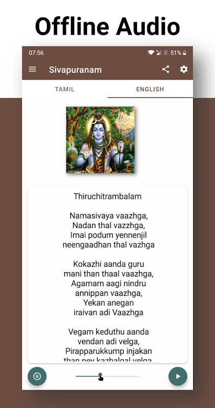🚀 Siva puranam'ın sesi herhangi bir aksaklık olmadan duraklatılabilir ve devam ettirilebilir. Ayrıca, telefonunuzu aynı anda başka bir etkinlik için kullanmak istiyorsanız, ses arka planda da çalışabilir.