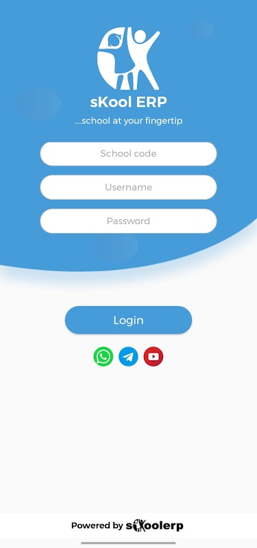 Okul kodu, kullanıcı adı ve şifre, SMS yoluyla aldığınız kod olmalıdır ve üst portal (ör: schoolname.skoolerp.in) giriş bilgileri de aynıdır.