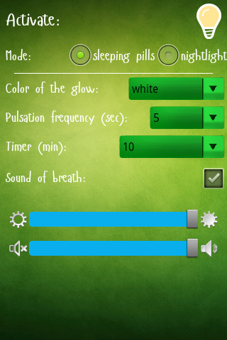 We decided that the phone has all of these features. Why do you need to buy unnecessary and expensive device? Functional (as compared to the prototype) has increased considerably. You can choose different colors of light, choose a specific time for automatic shutdown (full version only). Despite the fact that the pulsation is visible when the eyes are closed (in the room should be dark), however, we also added the sound of breathing that accompanies the pulse. The default pulse frequency is 5 seconds. This is the average for adults. But for the children, you can configure a more frequent pulse. Children breathe more often. When the glow is bright, it is necessary to inhale when the glow fades to exhale. If you breathe more or less frequently, you can set a different frequency. The application has a lot of options for different types of breathing.