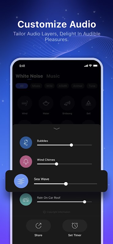 SleepyNight, zengin uyku sesi seçimine ek olarak, tamamen kişiselleştirilmiş bir deneyim için karıştırıp eşleştirebileceğiniz çok çeşitli beyaz gürültü sesleri sağlar. İster vantilatörün hafif uğultusu, ister yağmurun hafif pıtırtısı, ister okyanusun uzaktan gelen sesleri olsun, kendi ses karışımınızı özelleştirin ve huzurlu, kesintisiz bir gece uykusunun keyfini çıkarın. İdeal ses ortamınızı bulmak için ses seviyesini ve katmanlamayı ayarlayın ve beyaz gürültünün büyüsünün sizi derin, kesintisiz bir uykuya sürüklemesine izin verin.