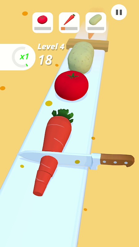 Bir sebze ve meyve dilimleme simülatörü oyunu. Yenilebilir yiyecekleri kesmek, engellerden kaçınmak ve daha fazla para kazanmak için Dokunun ve Basılı tutun.