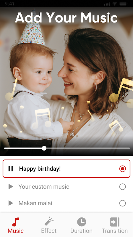 2. En sevdiğiniz şarkıyı ekleyin, geçişi, efekti, çerçeveyi, süreyi vb. ayarlayın