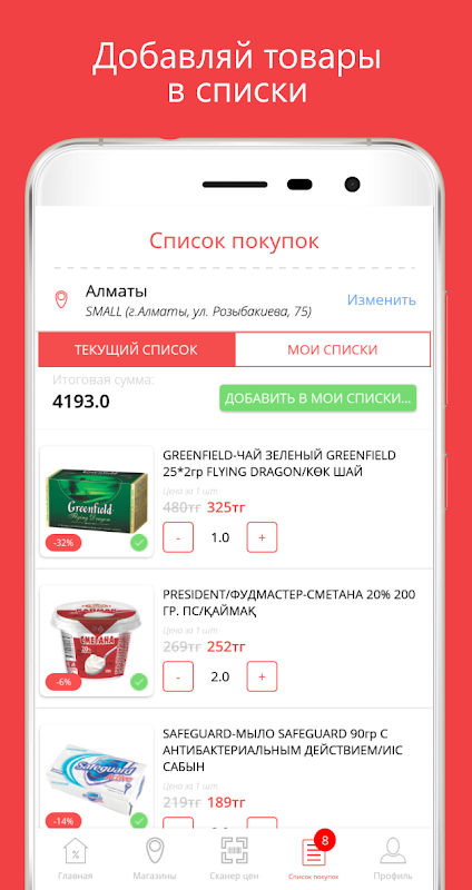 - Заранее создавать желаемый список покупок, где автоматически фиксируется итоговая сумма;