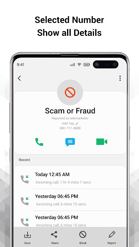 No more staring at your phone debating whether to pick up or not. Report or block spam calls with ease.