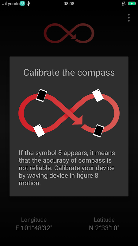 Bu akıllı pusulanın veya GPS olmayan pusulanın doğruluğu, cihaz başka bir manyetik parazitin yakınında olduğunda bozulacaktır; bu dijital pusulayı kullanırken başka bir elektronik cihaz, pil, mıknatıs vb. gibi manyetik nesnelerden/nesnelerden uzak durduğunuzdan emin olun. Bu akıllı pusulanın veya GPS olmayan pusulanın doğruluğu güvenilmez hale gelirse, telefonu aynı anda çevirerek ve 8 numaralı modelde (ekran görüntüsünde gösterildiği gibi) ileri ve geri hareket ettirerek dijital pusulayı kalibre edin.