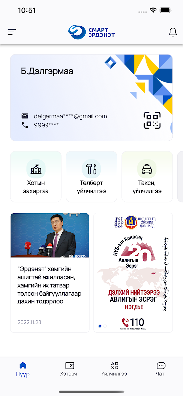 Buna taksi çağırma ve teslimat, doktor randevusu alma, çöp siparişi verme, su ve ısı faturanızı ödeme, yakınınızdaki tüm servis merkezleri hakkında tek bir yerden bilgi alma gibi hizmetler dahildir. Ayrıca bu uygulama yardımıyla size en yakın otobüs güzergahlarını ve otobüs duraklarını da görebilirsiniz. Akıllı Erdenet uygulaması üzerinden kullanıcılar birbirleriyle sohbet edebilmekte ve ödeme sistemi de sağlanmaktadır. Bu sayede vatandaşlara yönelik 20'ye yakın hizmetin yer aldığı kompleks bir uygulama Erdenet sakinleri tarafından kullanılmaya başlandı.