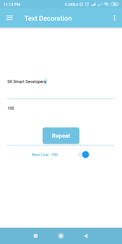 By using this application you can send the same message at multiple times. This app is combo pack for the all repetition app with a low size of the APK It is one kind of message repeater to send message repeatedly, and also you can set your repetition limit with new line text repetition. Using this app you can also make repeated letters using alphabet and emoji characters. Also, provide random emoji characters. Very easy to use and required few click for your message repetitions. Repetition process works asynchronously for longer repetition limits.