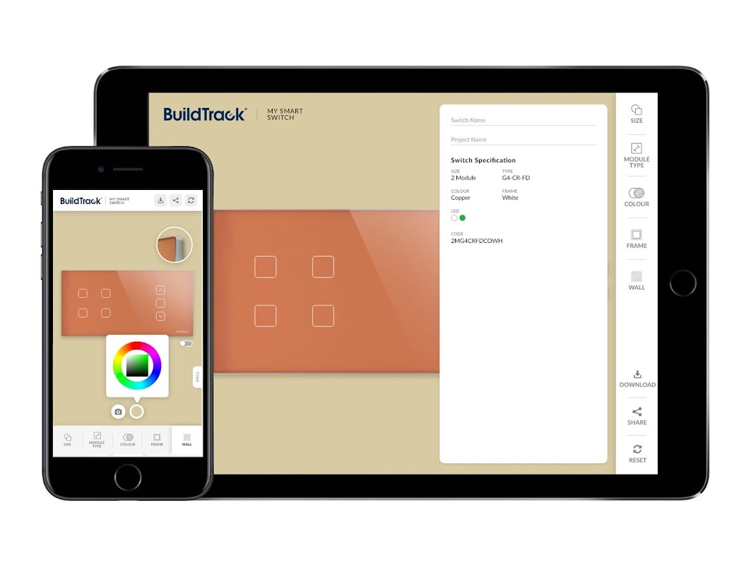 Bu Uygulama Mimarların, İç Mimarların ve Müşterilerin BuildTrack Akıllı Dokunmatik Anahtar tarafından sağlanan estetik ve işlevsel kombinasyonları kullanarak "Anahtarlarını Oluşturmalarını" sağlar. Seçilen anahtar, çeşitli arka plan renklerine veya resim galerisinden veya kameradan alınan resimlere göre sıralanabilir. Uygulamada bir anahtar oluşturulduktan sonra başkalarıyla paylaşılabilir ve BuildTrack ile sipariş vermek için saklanabilir