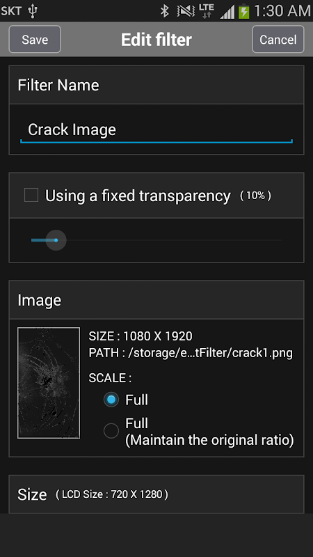 Düşük şeffaflık (% 10) bu filtreyi uyguladıktan sonra LCD'de kırık ayarlamak gibi görünüyor.