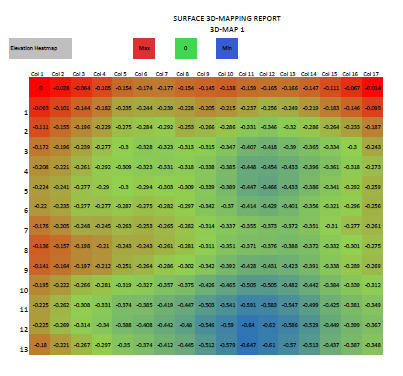 The 3D Mapping Report Generator imports the Free Run measurement data from multiple runs taken with the Axiom in columns across a given work surface. The data is then displayed as a stunning and immersive 3D map of the measured surface elevations.