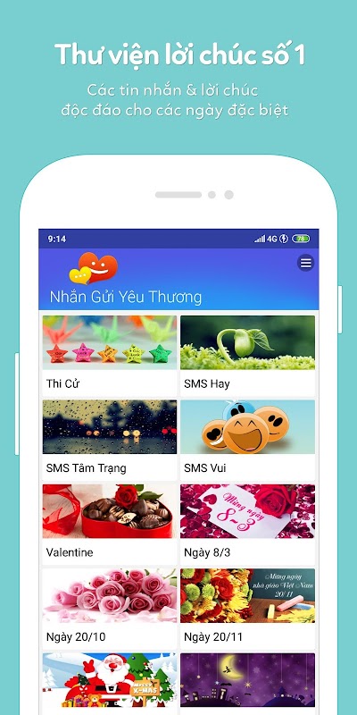 - 📚Hơn 10000 Tin Nhắn SMS & Lời Chúc được chọn lọc kỹ càng cho 18 chủ đề và ngày đặc biệt trong năm.