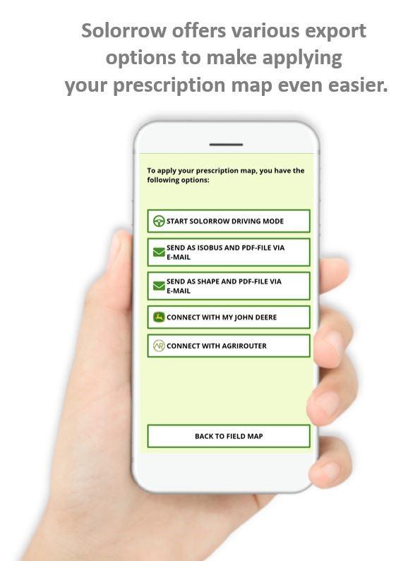 Şimdi uygulamaya geçelim: Her bir alan bölgesi için manuel bir doz oranı ekleyebilir veya Solorrow'un bölge potansiyel farklılıklarına dayalı olarak optimize edilmiş bir doz oranı önermesine izin verebilirsiniz. Bu bireysel reçete haritasını E-Posta yoluyla ISOBUS ve Şekil dosyası olarak dışa aktarabilir ve ayrıca masaüstü bilgisayarınızda açabileceğiniz ve hatta yazdırabileceğiniz reçete haritanıza genel bir bakış içeren bir PDF dosyası alabilirsiniz. Hemen başlamak ister misin? Yenilikçi Solorrow sürüş modunu deneyin; mobil cihazınız bir makine terminaline dönüşür. Solorrow ile. her tarla bölgesine en uygun şekilde muamele edilir ve gübreleme daha hassas ve verimli hale gelir.