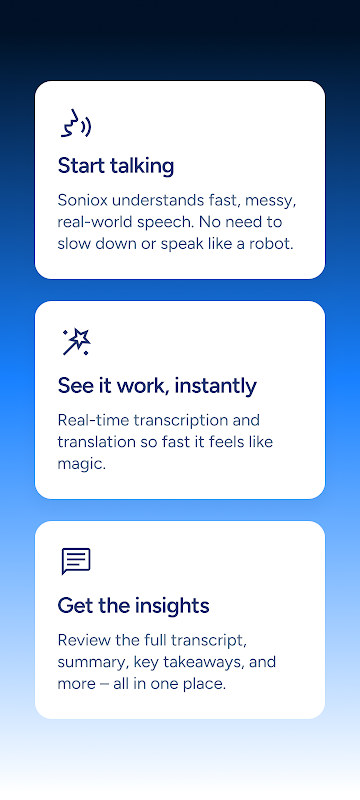 - Konuşma Çevirisi (Tek Yönlü ve Çift Yönlü): Farklı dilleri anlayın ve iletişim kurun. Soniox, doğal konuşmalar için konuşmaları gerçek zamanlı olarak tek yönlü veya çift yönlü çevirir. - Yapay Zeka Özetleri ve Önemli İçgörüler: Konuşmalarınızdan veya toplantılarınızdan anında özetler, yapılacaklar listeleri, alıntılar ve vurgular alın. Dersler, röportajlar ve değerlendirmeler için mükemmel.