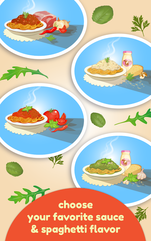 Select the spaghetti type from the recipe menu and start cooking your own pasta meal. The pan is already waiting for you to make your favorite sauce. Mix all the prepared ingredients and cook them slowly until they become soft, creamy and delicious. This way you can make various pasta sauces, such as tomato sauce, meat sauce, cheese sauce or pesto sauce. Then take the spaghetti of your choice and put them in a large pot of boiling salted water. When they are cooked strain them in a colander. Pour your sauce over spaghetti and add your final touch with many additional ingredients and food toppings like herbs, vegetables, sausages, meatballs, cheese and even toys.