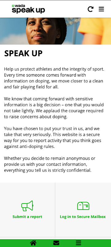 Speak Up! Uygulamanın sporda doping ihlallerini rapor için güvenli ve gizli bir yol sunar. Dünya Anti-Doping Ajansı (WADA) İstihbarat ve Soruşturma Ekibi tarafından yönetilmektedir. Bu ekip gizliliğini sağlamak için WADA içinde bağımsız olarak çalışır.