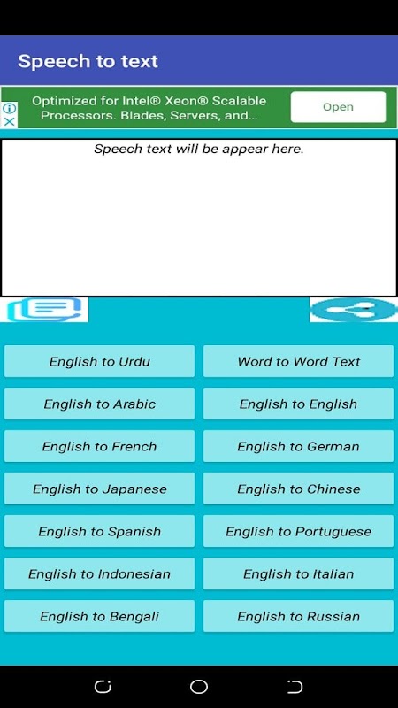 - No more effort to write text messages, Share the translated text of different languages via share button directly on Whatsapp or on social media, No scroll down option, world most speaking languages option has been placed at one place, Covert English Speech into multiple languages, Arabic, Urdu, French, Japanese, Spanish, Indonesian, Bengali, German, Chinese, Portuguese, Italian and Russian and we believe Its accurate therefore it has been linked with Google's speech recognition service.