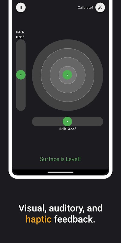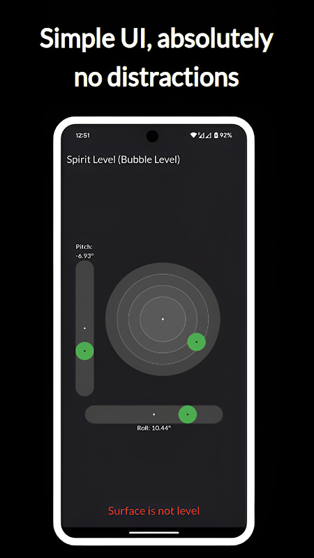 Spirit Level (Bubble Level), herhangi bir yüzeyin tesviyesini hassas bir şekilde kontrol etmenize yardımcı olmak için tasarlanmış basit ve sezgisel bir uygulamadır. İster bir resim asıyor, ister rafları yerleştiriyor, ister Kendin Yap projeleriyle uğraşıyor olun, bu uygulama, perde ve yuvarlanmayı ölçmek için cihazınızın sensörlerini kullanarak gerçek zamanlı geri bildirim sağlar.