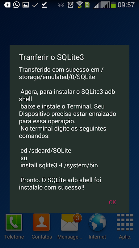 2) Em seguida vai exibir um diálogo perguntando se deseja transferir o SQLite3 ADB Shell.