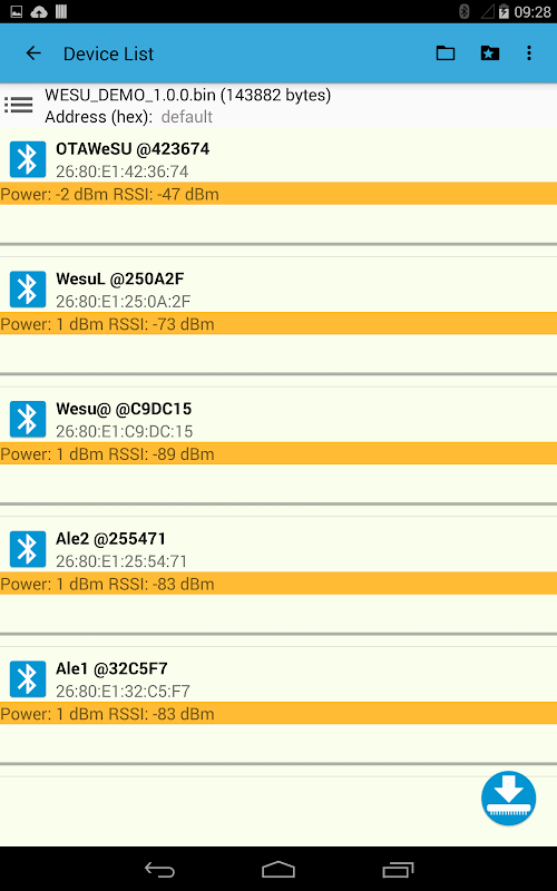 Mevcut Bluetooth LE ST BlueDFU uygulaması aramalar çevresinde düğümlerin ve BLE isim, adres ve sinyal gücü (TX güç ve RSSI) dahil olmak üzere her keşfedilen düğüm için belirli bilgileri döndürür. Bir düğüm tıklayarak düğüme bağlanmak ve ST BlueNRG OTA protokolü destekleyen özellikleri aramak için bir girişim zorlar.