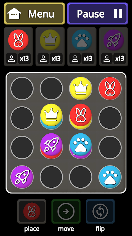 On a 4x4 grid board, up to 4 players compete using 16 stones each. The goal is simple: stack, flip, and move your pieces to form three in a row. The first player to do so wins.